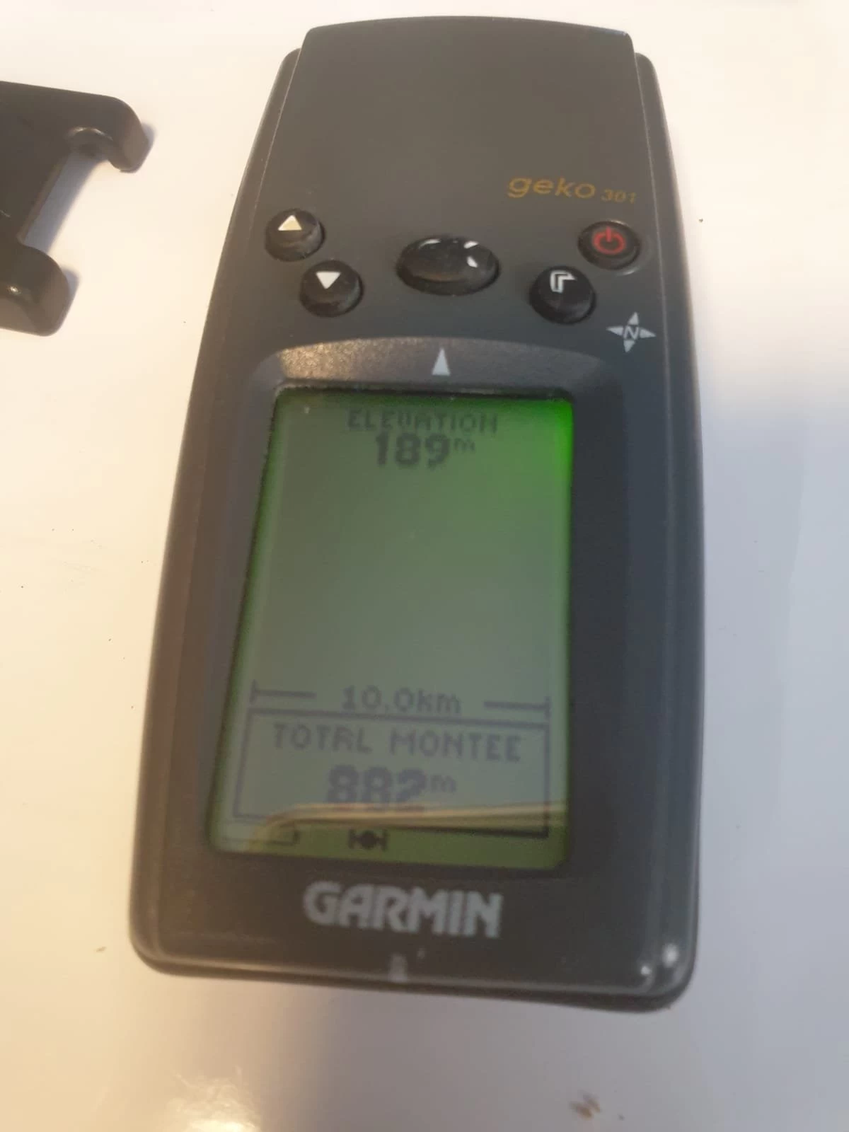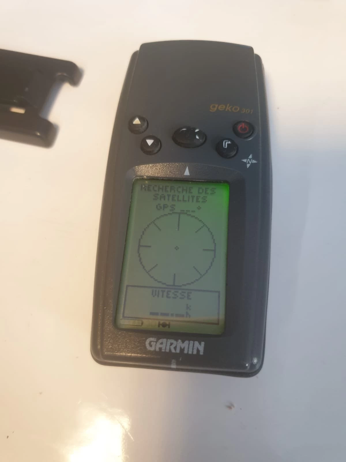Garmin GPS Geko 301 en bon état, des traces d’usures sur les boutons (voir photos). Muni d’un support vélo à fixation guidon. Il fonctionne avec deux piles AAA.