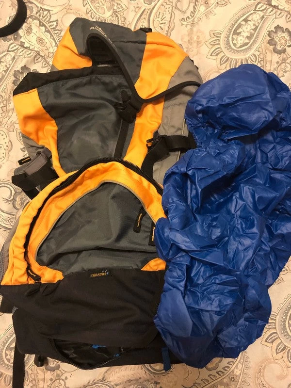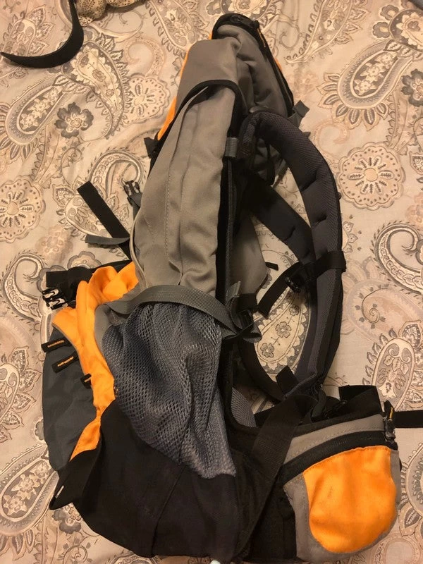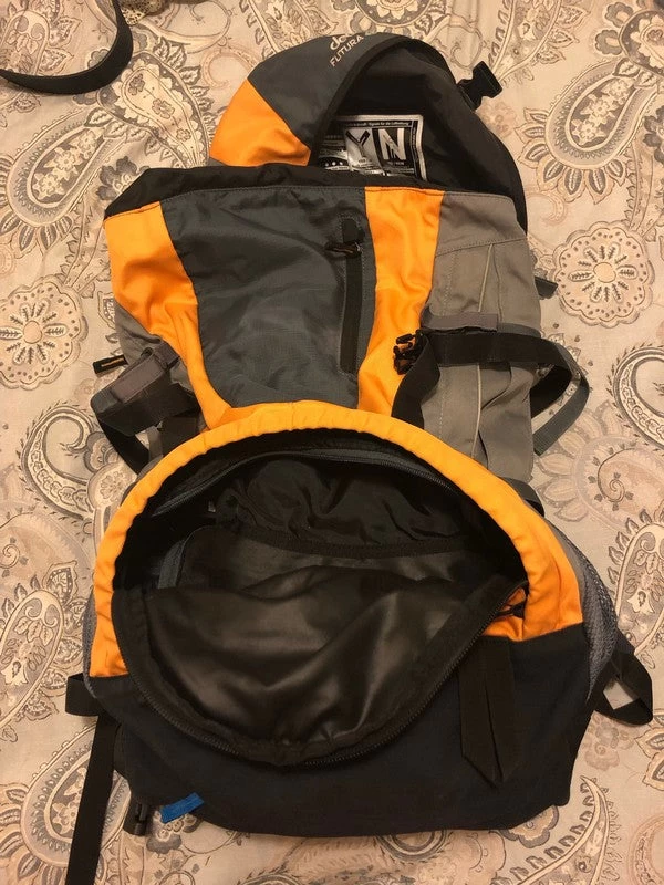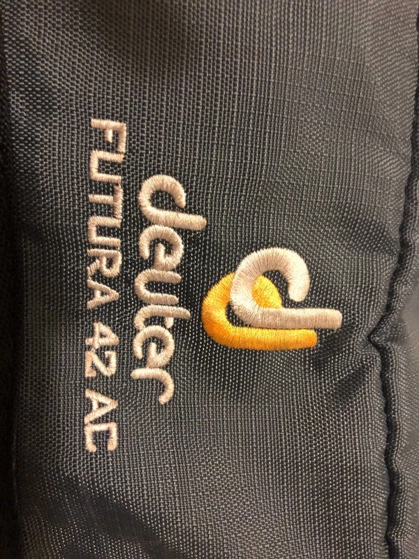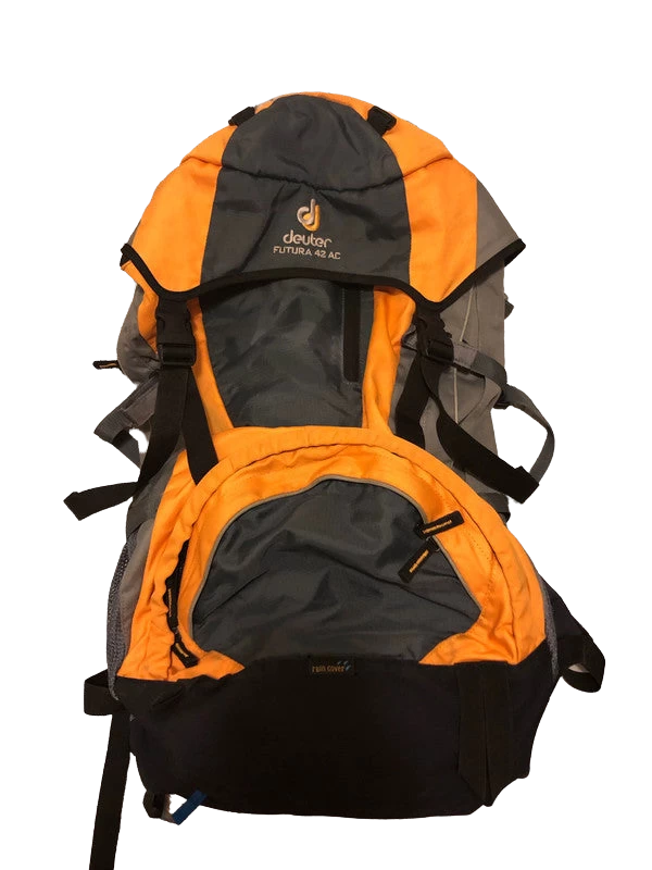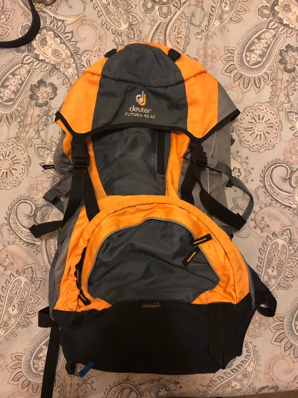 Sac à dos de montagne Deuter 42 litres, jaune, noir et gris. Il a de nombreuses poches (plusieurs à l’intérieur), il a un dossier pour éviter la transpiration, des sangles très confortables pour l’attacher au corps.