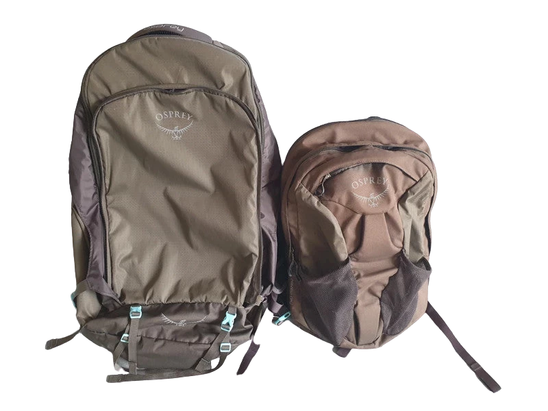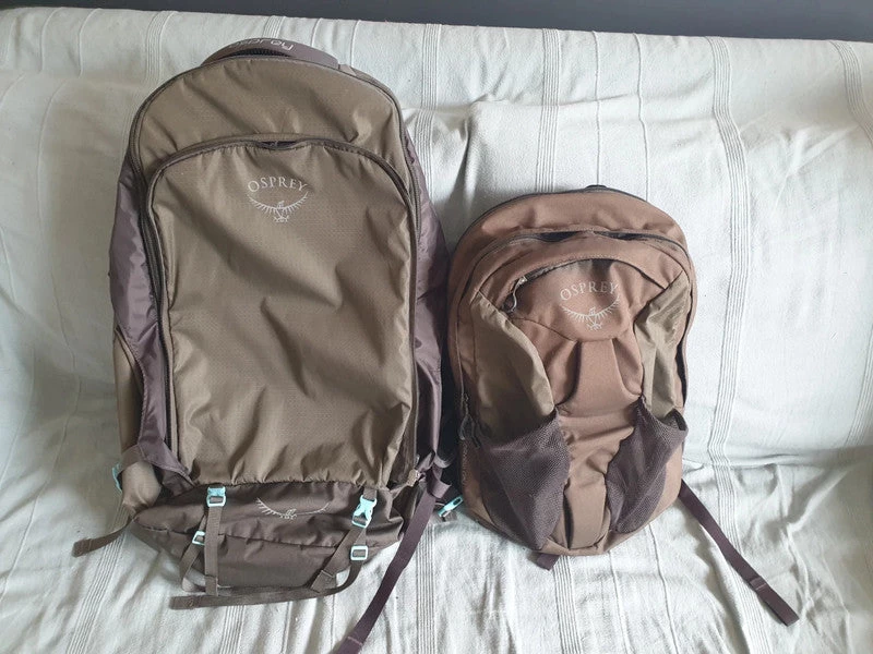 Sac voyage backpack Osprey 70 litres + sac Farview day 10 litres qui s’accroche au sac.