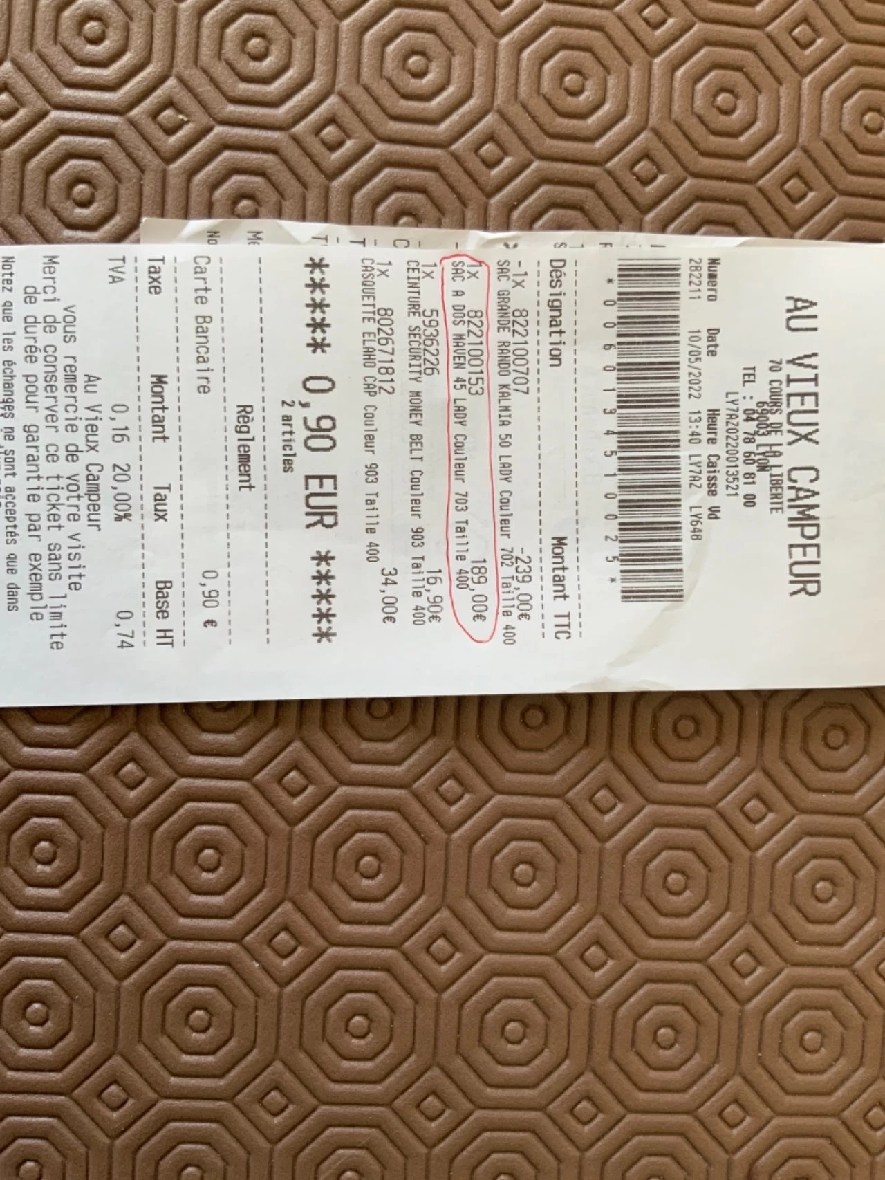 Achat effectué le 10/05/2022 Au vieux campeur à Lyon (facture en photo )