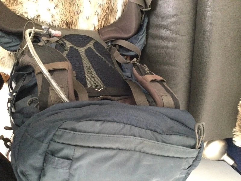 Sac bleu Osprey Xenith 75 + sac d’étanchéité Osprey XL (sans la poche à eau présente sur la photo en illustration)