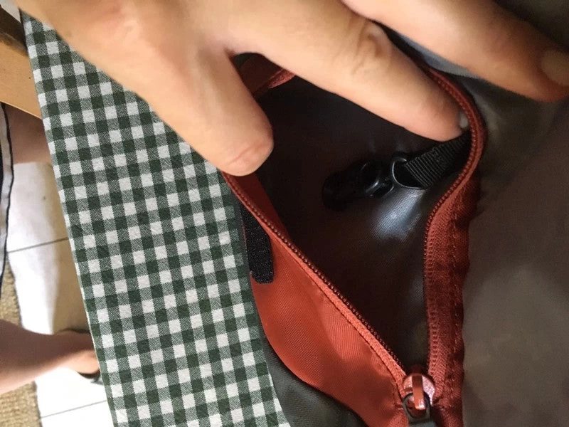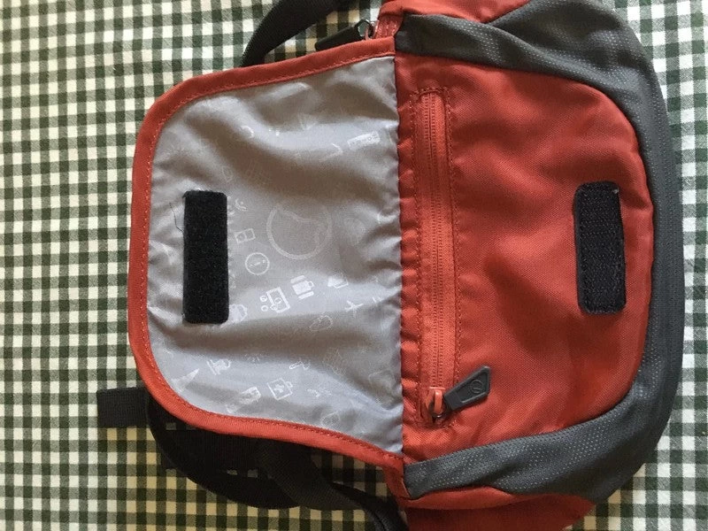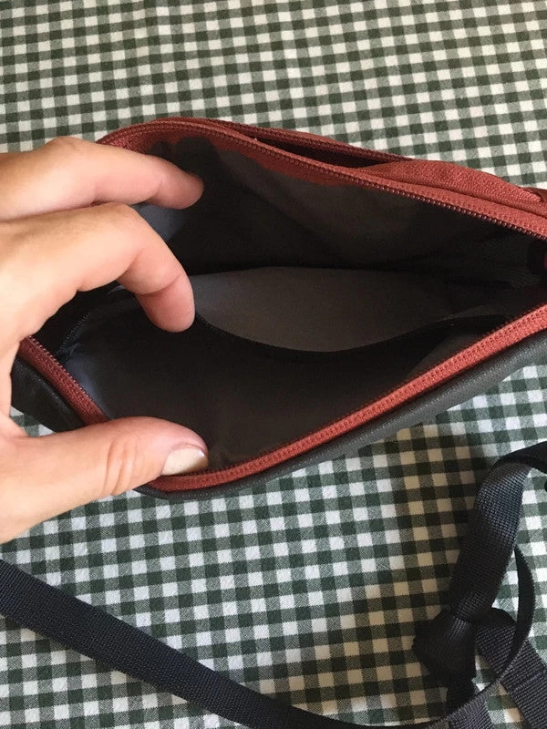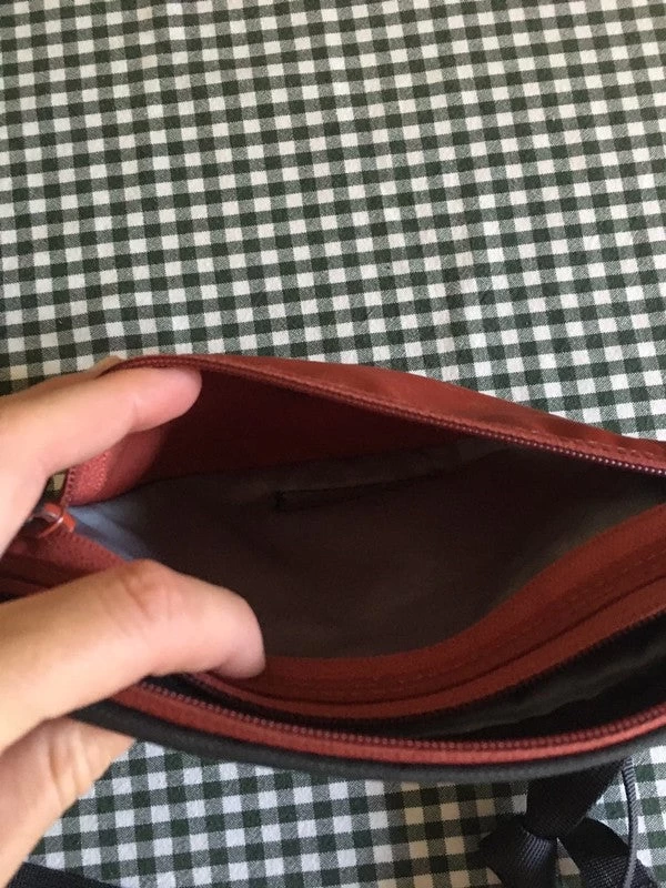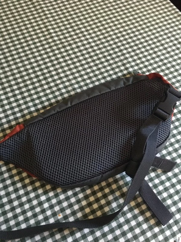 Sac de taille unisexe spacieux, bicolore brique et gris foncé. Trois poches, dont une avec porte-clés. Utilisé mais parfait, à l’exception de quelques imperfections sur le devant comme sur la photo.