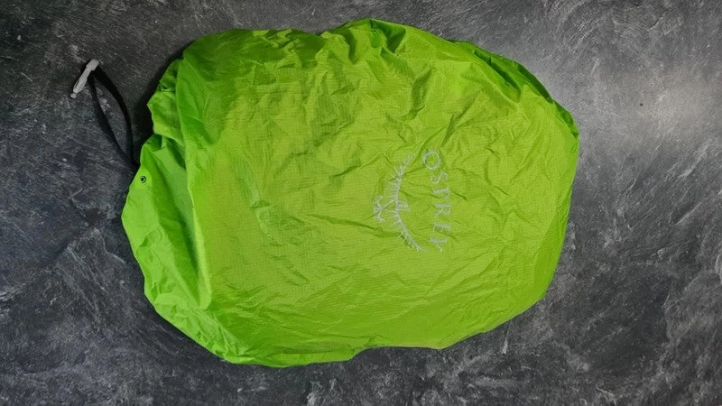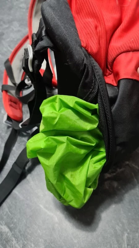 Sac à dos Osprey Hikelite 18 de couleur rouge, avec housse de pluie intégrée dans une poche sous le sac.