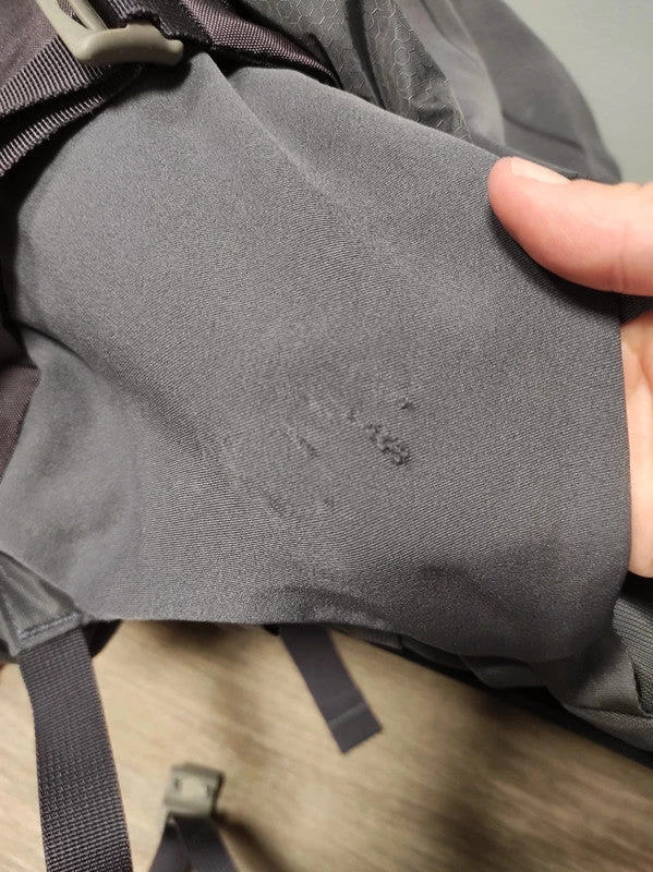 Défauts visibles sur les 2 dernières photos, accro sur une poche filet de côté et une éraflure sur le devant (non troué, 3mm de long)