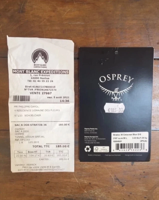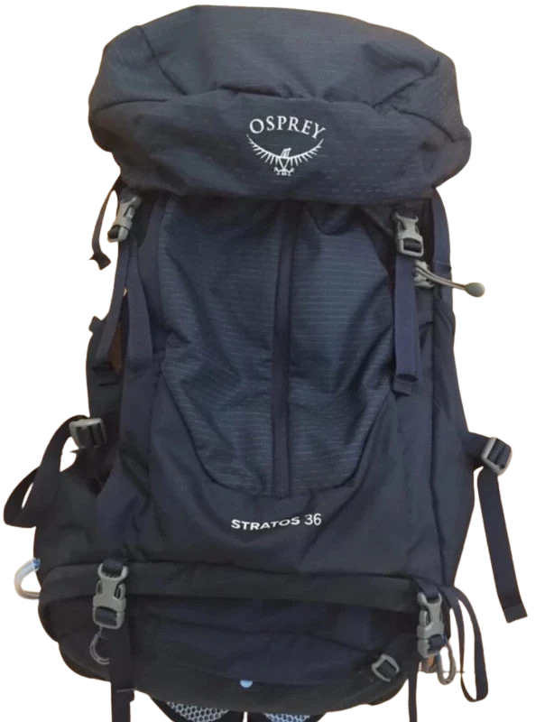 Sac de randonnée Osprey, modèle Stratos 36L. Il est en parfait état, idéal pour les séjours itinérants. Seule la housse de protection a deux petits accrocs qui se trouvent à l’arrière, ça n’altère en rien son étanchéité une fois que le sac est sur le dos.