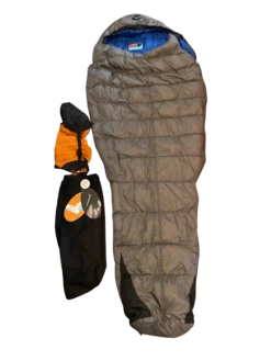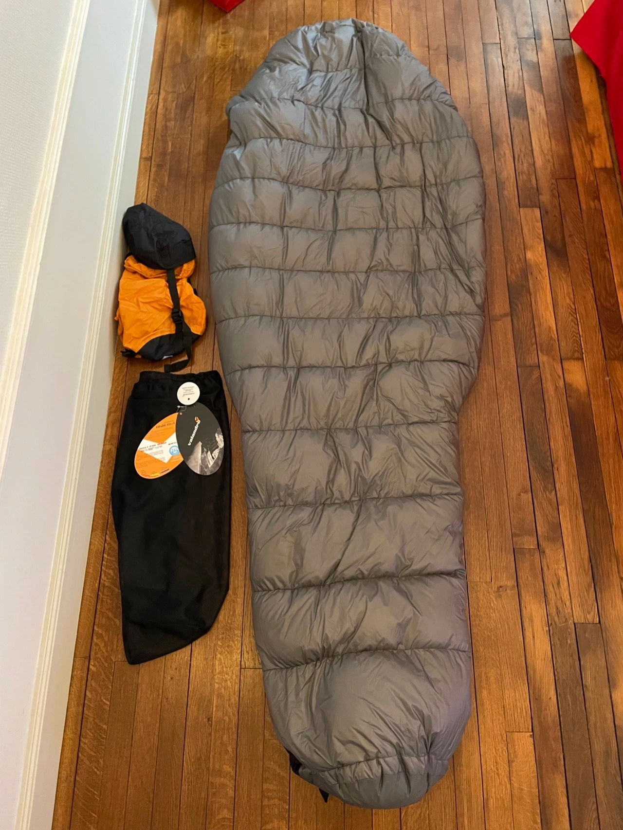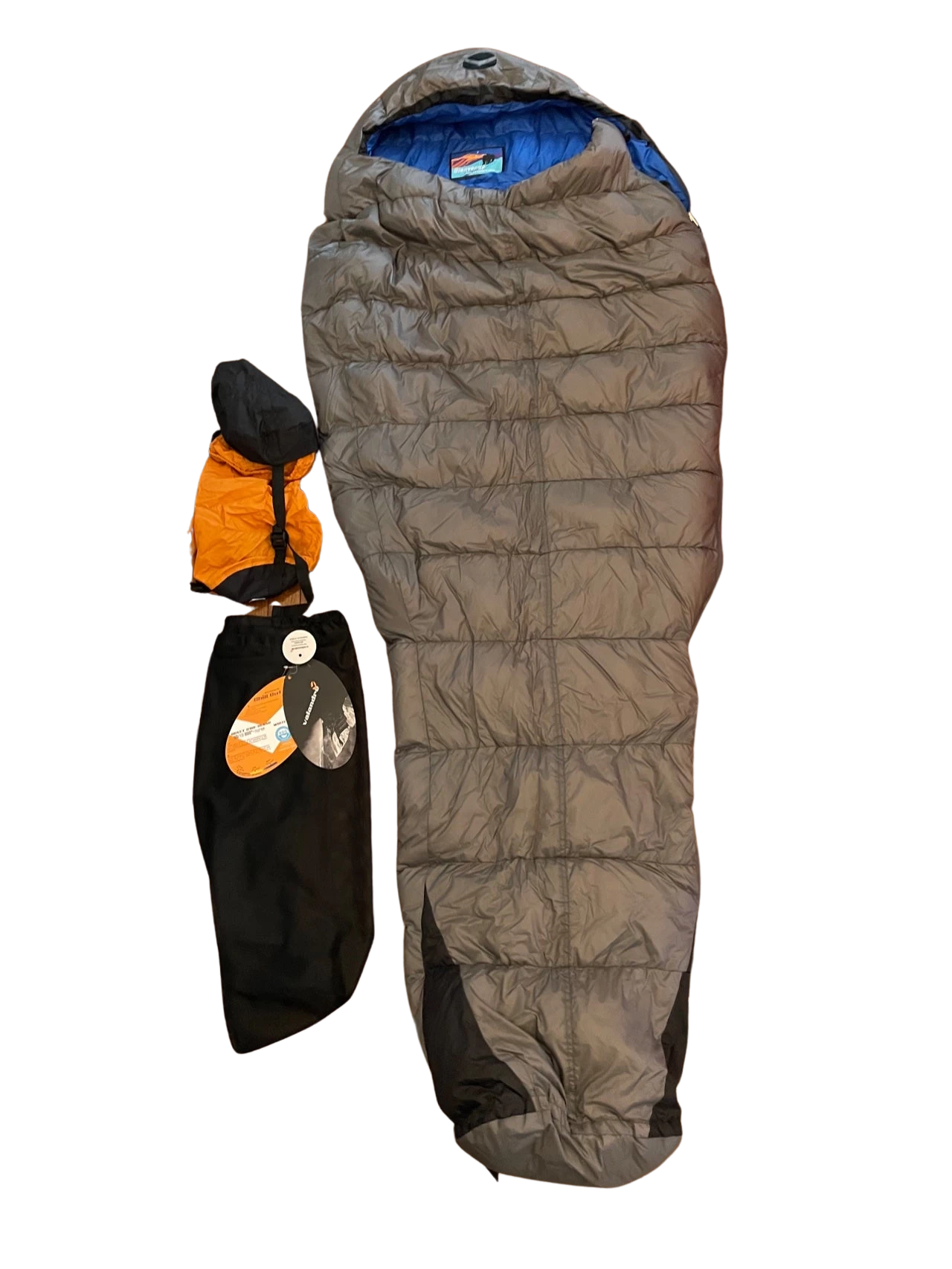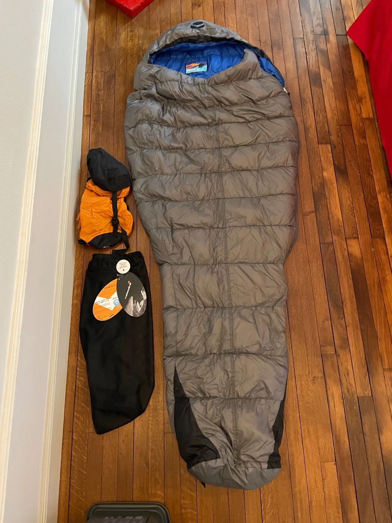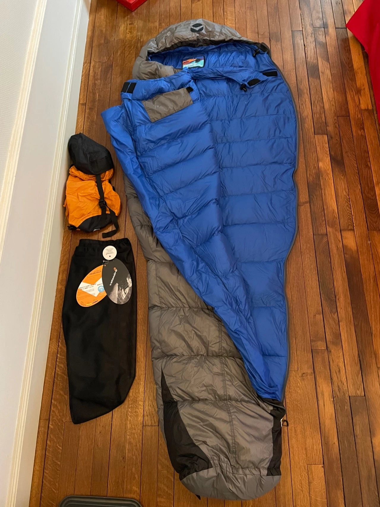 Taille S( Longueur : 200cm ; largeur d’épaule : 159; largeur Hanche : 135 cm) . Fermeture gauche . Volume compressé : 5,5L ; forme sarcophage avec capuche .